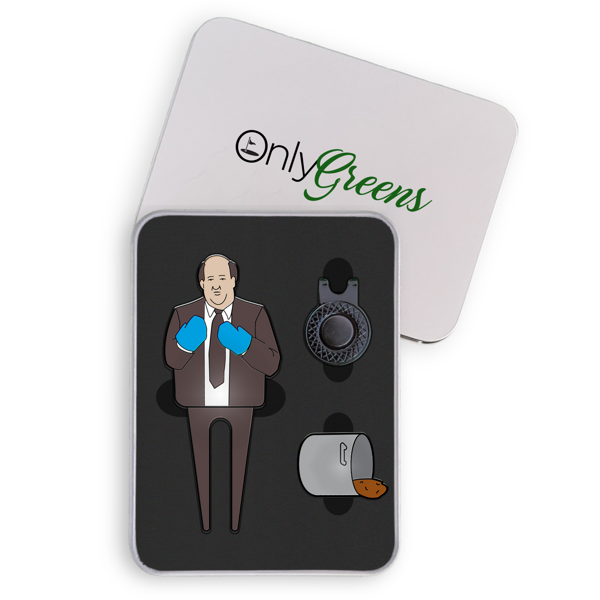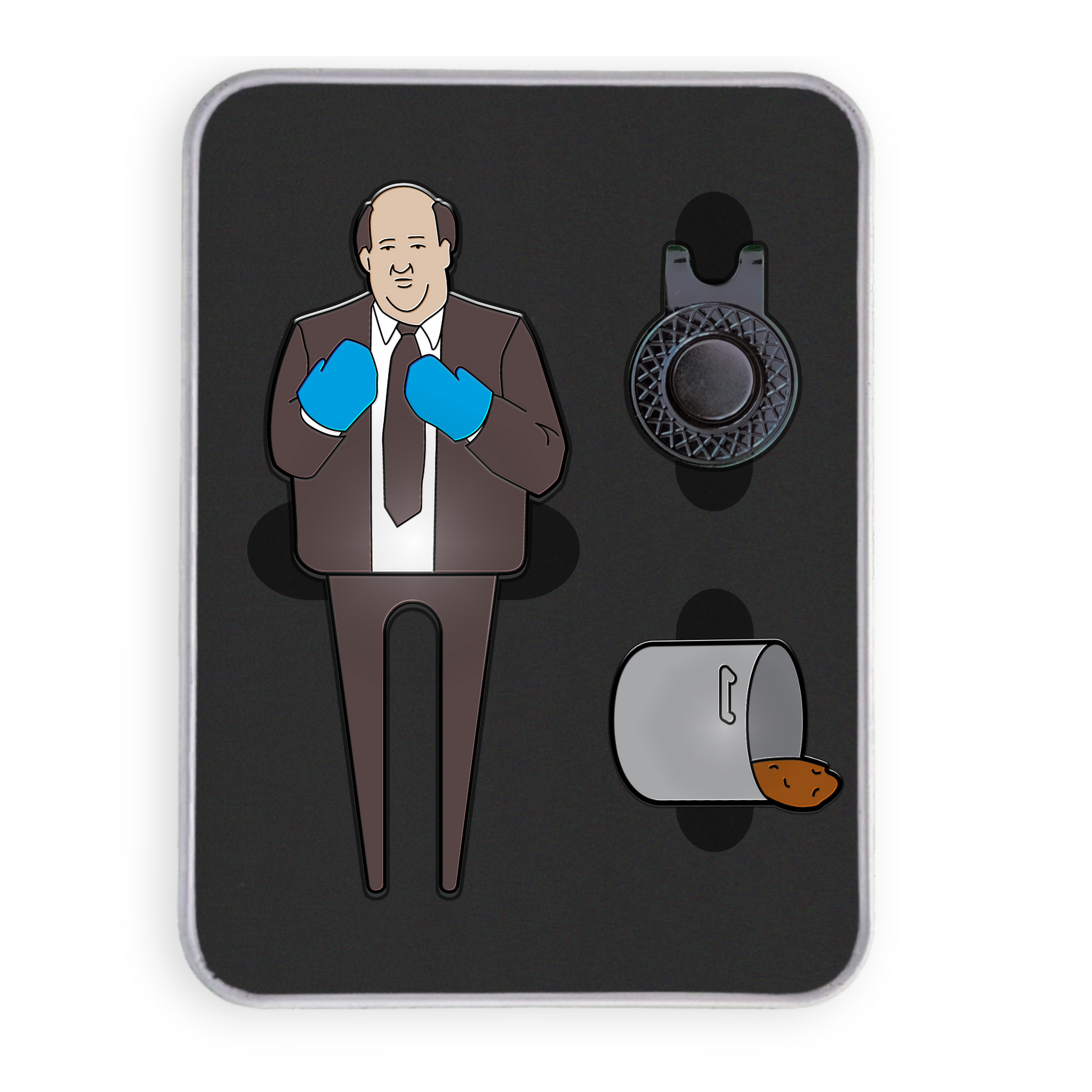 Designed with passion for golf, the set includes a specially crafted divot tool featuring everyone's favourite chilli-spilling accountant and a distinctive ball marker. The ball marker easily attaches to and removes from the divot tool, providing both functionality and a fun, nostalgic flair.