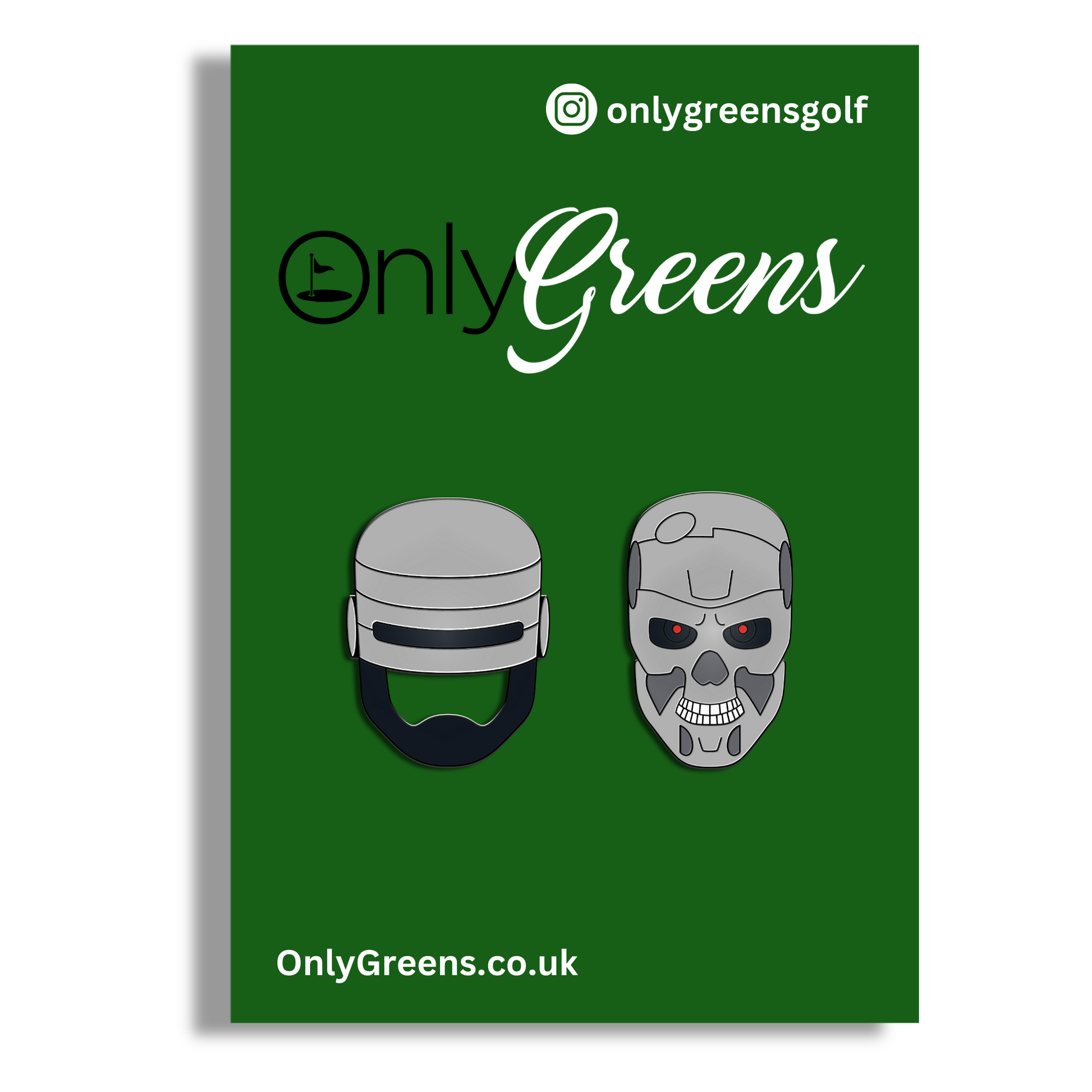 Step onto the course with a bold, sci-fi edge with our robot-inspired golf ball marker set. Featuring designs of a sleek armoured law enforcer helmet and a relentless cybernetic terminator, this set adds a powerful and striking presence to your round. Perfect for fans of futuristic action and golf enthusiasts alike, these markers make every putt feel like a mission to dominate the green!