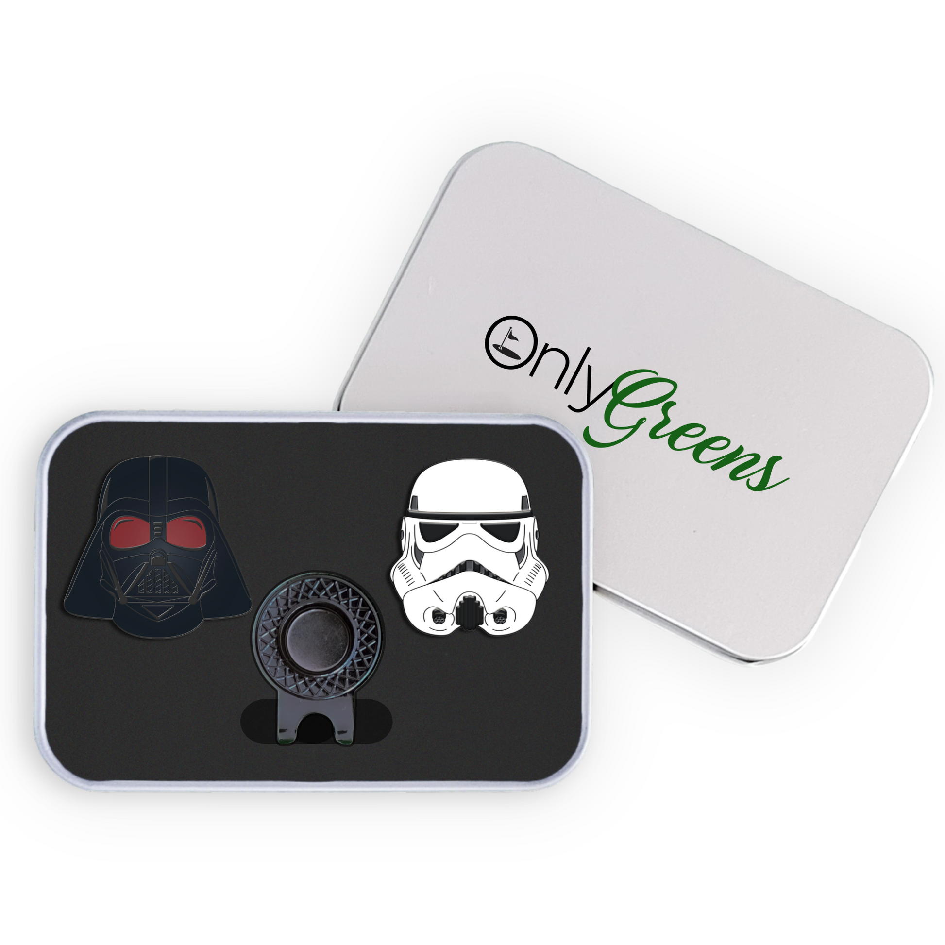 Bring a bold edge to your game with our Dark Side golf ball marker set. Featuring designs that celebrate two legendary helmeted figures, this set adds a powerful and commanding presence to your round. Perfect for fans of epic battles and golf enthusiasts alike, these markers make every putt feel like part of a galactic showdown.