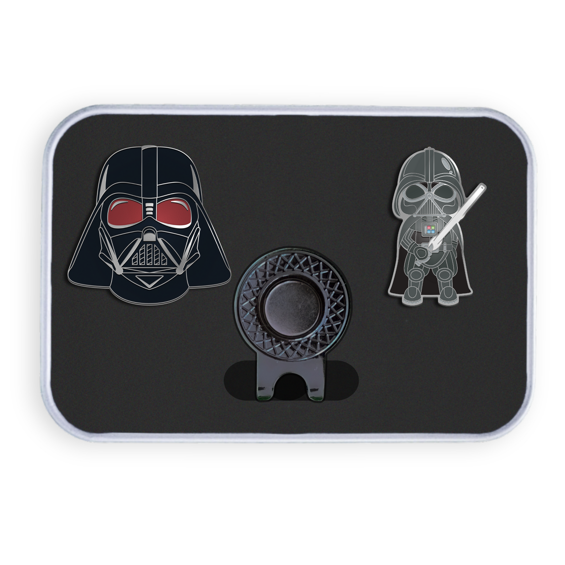 Bring a bold edge to your game with our Dark Side golf ball marker set. Featuring designs that celebrate two legendary helmeted figures, this set adds a powerful and commanding presence to your round. Perfect for fans of epic battles and golf enthusiasts alike, these markers make every putt feel like part of a galactic showdown.