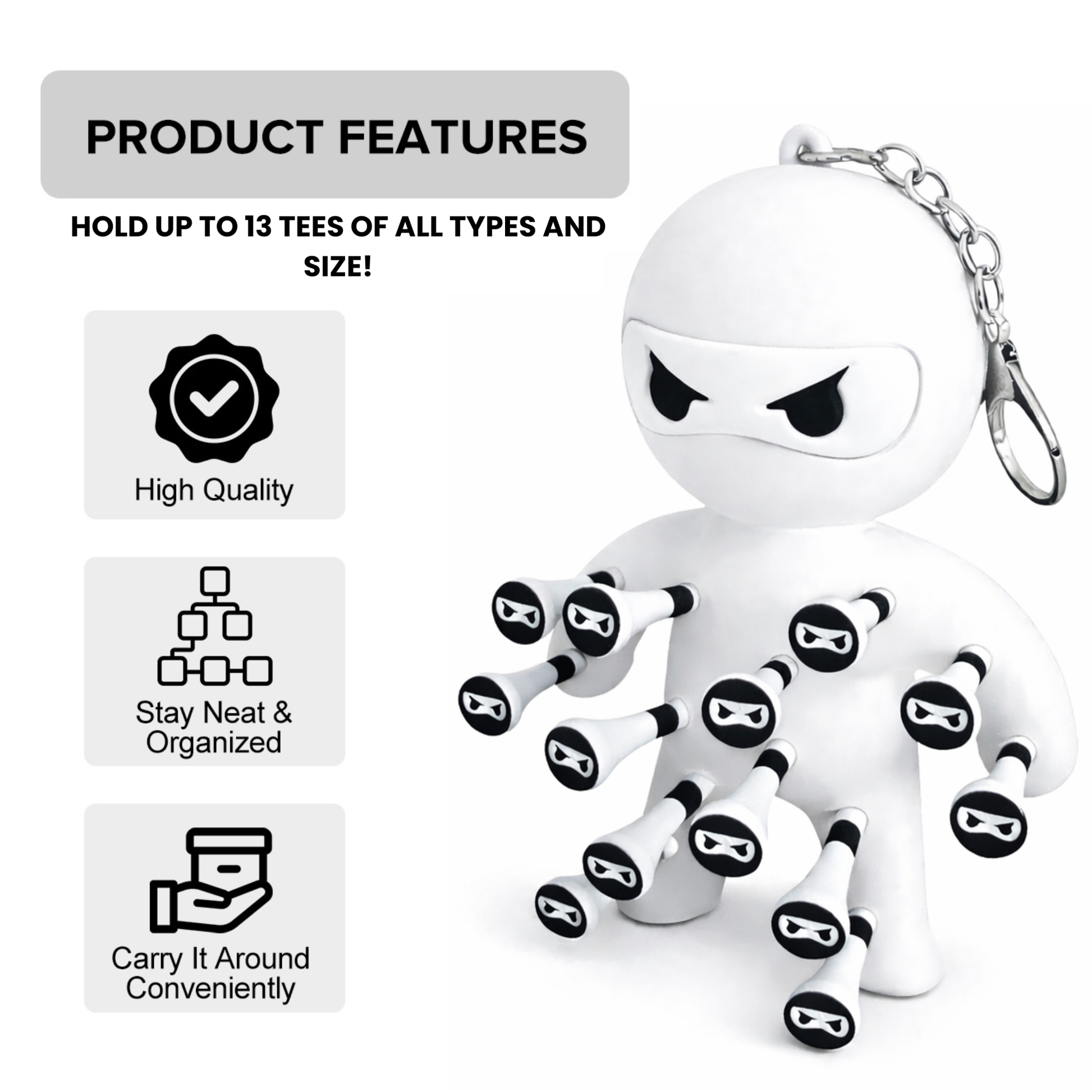 Tee Ninja Holder: Flexible silicone design, holding up to 13 tees securely.